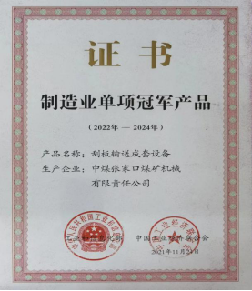 公司多项成果实现了国内首台首套、填补了行业领域空白,三个项目荣获国家科技进步一等奖、二等奖。2021年公司刮板输送成套设备被国家工信部评为“国家制造业单项冠军”产品(图4),“智能化异构SGZ1400/3000+2000型刮板输送机”被国家能源局认定为能源领域首台(套)重大技术装备。2018年、2020年先后研制的世界首台套总装机功率12000 kW和13455 kW超大采高综采综放成套智能输送设备,实现了单机传动功率、后部三驱交叉侧卸、大块煤多级预破碎、数字智能马达紧链等方面技术首创和突破,创造了行业多个国际新指标。2022年公司自主研发的国内首套500米超长SGZ1000/5000型智能刮板输送成套装备问世(图5),主要技术参数和性能指标达到国际领先水平,实现了2500kW大功率传动关键部件及控制系统全面国产化,满足了中厚煤层超长运距年产千万吨工作面输送设备需求。