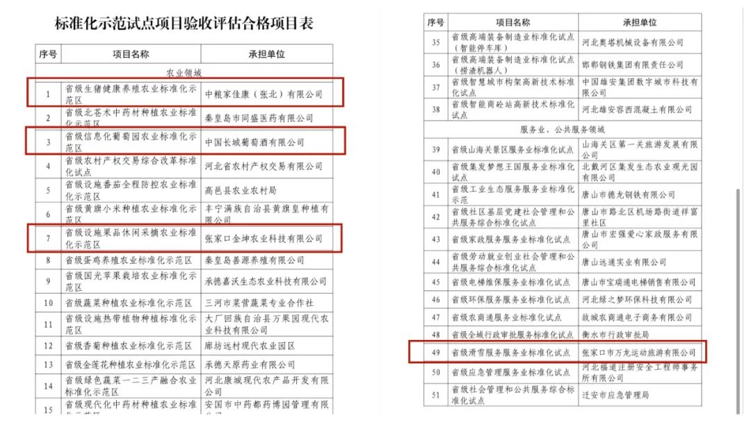 3月11日,河北省市场监督管理局公布了51个省级标准化示范试点项目验收评估合格名单。我市4个省级标准化示范试点项目通过验收。其中,农业领域3个:中国长城葡萄酒有限公司承担的省级信息化葡萄园农业标准化示范区,张家口金坤农业科技有限公司承担的省级设施果品休闲采摘农业标准化示范区,中粮家佳康(张北)有限公司承担的省级生猪健康养殖农业标准化示范区;服务业领域1个:张家口市万龙运动旅游有限公司承担的省级滑雪服务服务业标准化试点。
